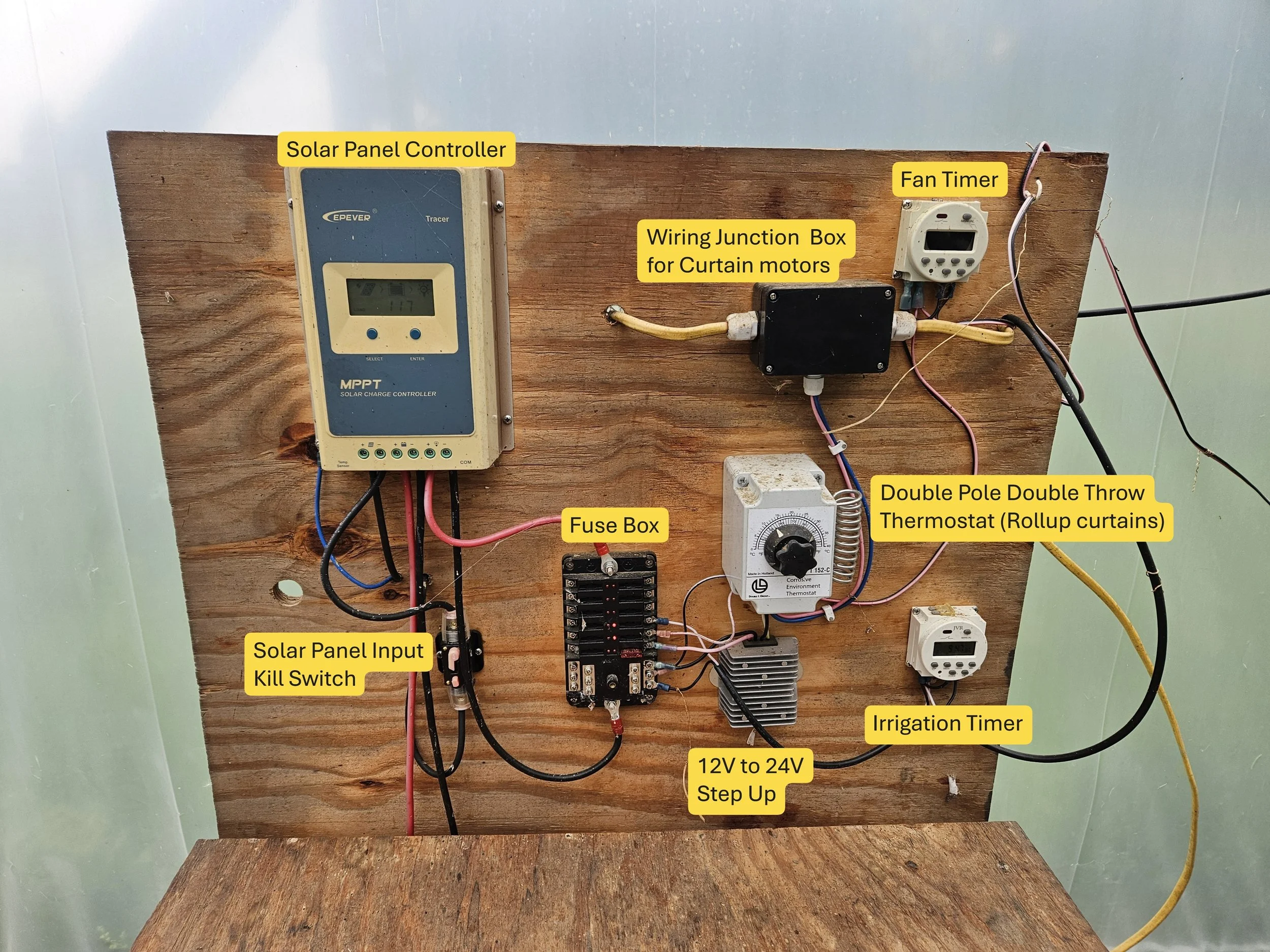 IMPORTANT NOTE ABOUT SOLAR PANELS!!! The size and number of solar panels and batteries you need is determined by how much power you need to run the greenhouse motors, the fan and the irrigation pump, etc. and how many hours they run per day. Your needs may be different from ours. We found a really helpful guide for sizing the solar panels, charge controller and number of batteries at a website called Solar Town. I recommend you find an engineer friend (or pay somebody) who can check your numbers. In particular, make sure your charge controller can handle the current load from your batteries - if it’s too small you can end up setting your greenhouse on fire.