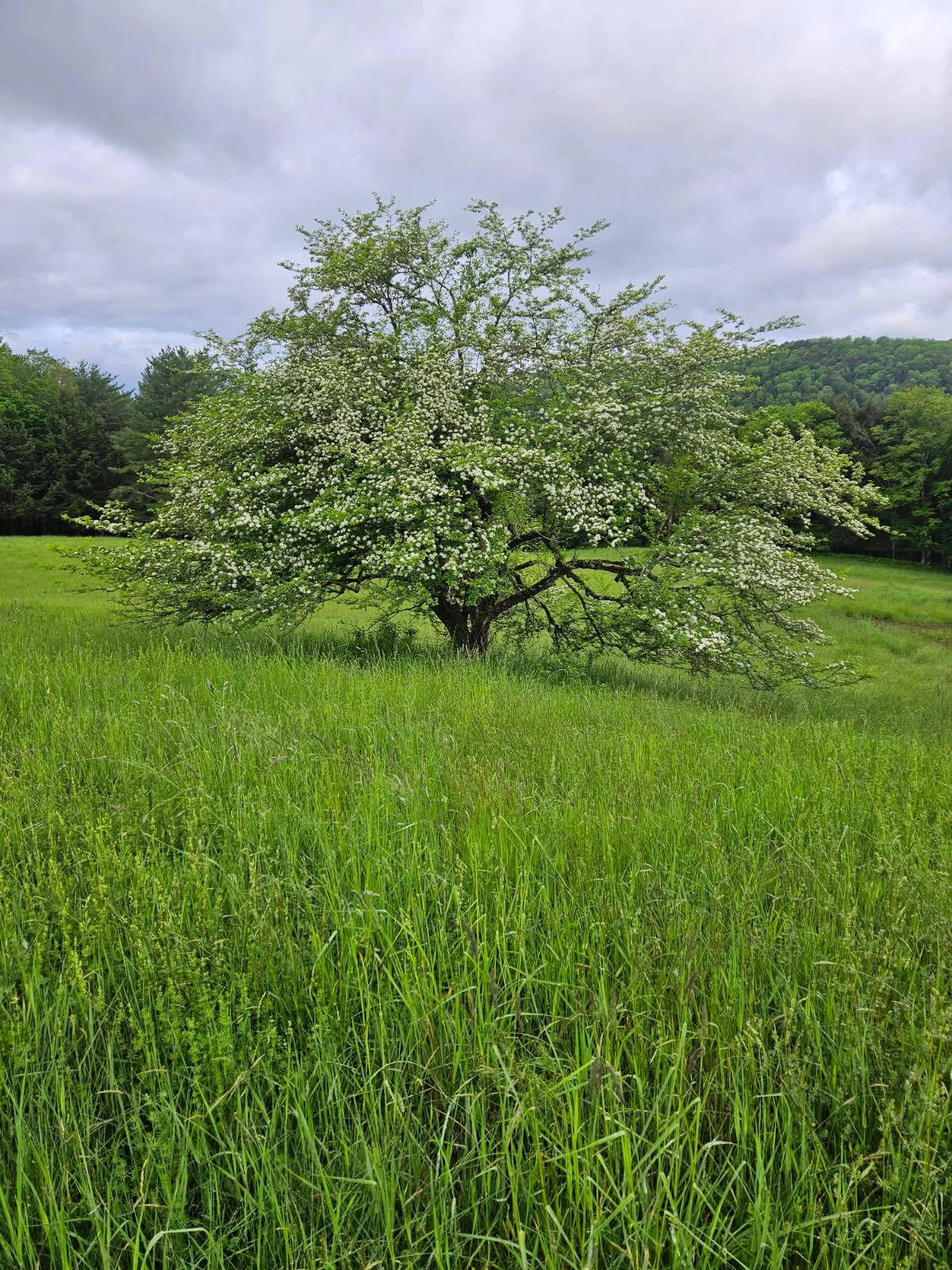 As you look across our fields, a single tree stands prominently in the Western view set against the Green Mountain skyline. This lone tree is a common hawthorn (Crataegus monogyna) which, in good years, is covered in white blossoms in May.